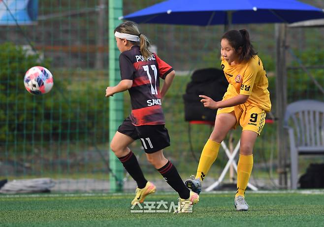 전남 광양중앙초 진경은(오른쪽)이 26일 경남 합천에서 열린 ‘2025 스포츠케이션 명품도시 합천에서 펼쳐지는 제33회 여왕기 전국여자축구대회’ 초등부 경북 상대초와 결승에서 중거리슛을 하고 있다. 2025. 6. 26.