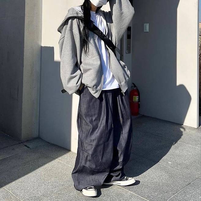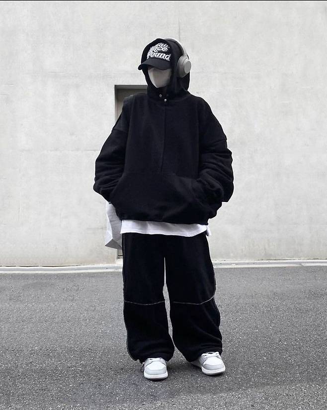 검정 후드 집업 + 박시한 티셔츠 + 와이드핏 팬츠+ 마스크, 후드, 볼캡으로 얼굴 가리기