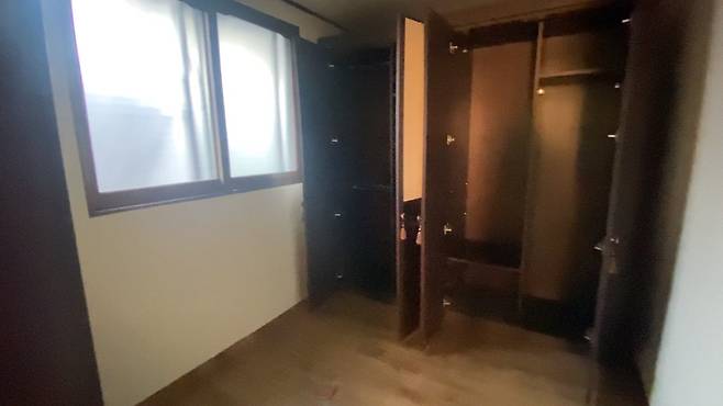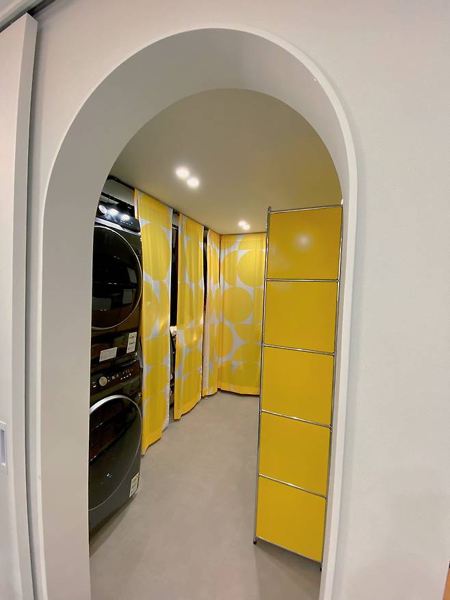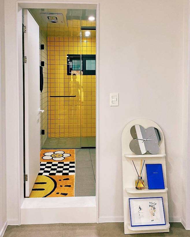 다음으로 보여드릴 공간은 드레스룸이에요. 바깥에서부터 노란 색감이 눈을 사로잡는, 컨셉추얼한 공간입니다.