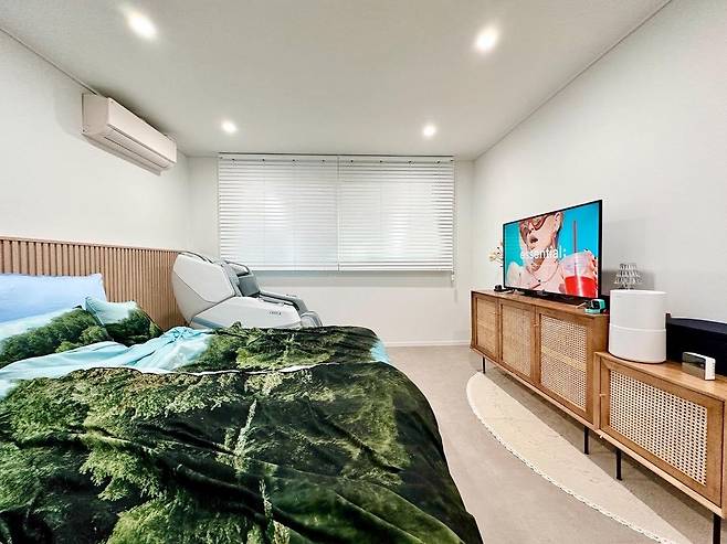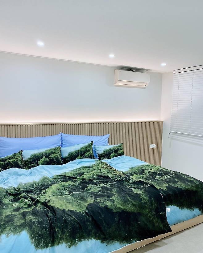 이곳은 최대한 아늑한 느낌으로 꾸미고 싶어, 다른 공간에 비해 우드 톤을 많이 사용했어요. 여기에 푸른 하늘과 초록색 나무가 돋보이는 베딩으로 포인트를 주었습니다.
