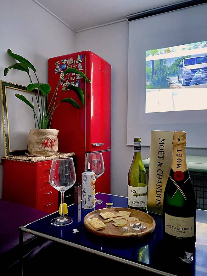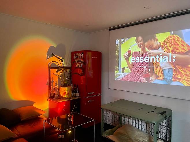 이렇게 빔프로젝터까지 쏘면 홈바라고 해도 손색없는 모습이 완성됩니다.