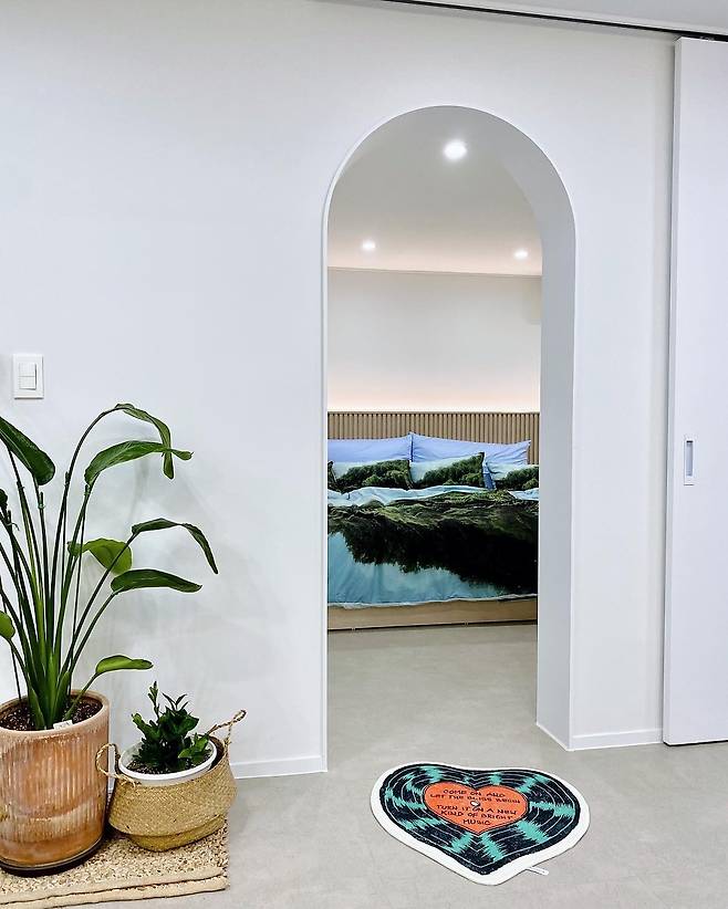 침실의 인테리어는 안쪽뿐 아니라 바깥쪽으로도 이어져요. 거실에서 바라보았을 때 예쁜 침실을 만들고 싶어서 문을 슬라이딩 도어로 달고 아치 게이트를 만들어주었거든요. 이런 포인트 하나하나가 모여, 모던하면서도 유니크한 인테리어가 완성된 것 같아요.