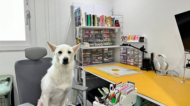 노란색이 돋보이는 책상은 제가 다이어리를 꾸미는 공간이에요. 투명한 수납장을 활용해서 다이어리 용품을 정리해두었는데, 보기만 해도 뿌듯하고 만족스러운 모습입니다. 최근에는 브이로그 영상을 올리던 채널을 다이어리 꾸미기 채널로 바꿔서 영상을 올리고 있어요. 그래서 책상을 자세히 보시면, 촬영용 장비도 찾아보실 수 있답니다.
