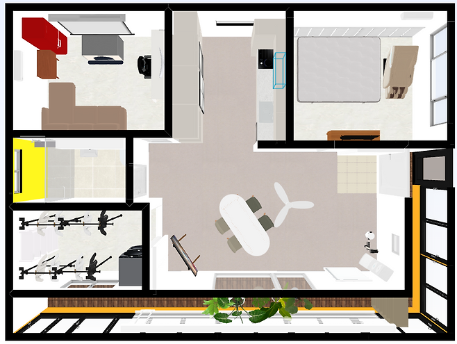 행거는 원래 검은 커튼이 함께 있던 제품인데, 노란 커튼을 따로 구매해서 바꾸어 주었더니 저희가 바라던 콘셉트의 인테리어가 완성되어서 만족스러워요. 실용성과 심미성을 모두 잡았달까요?
