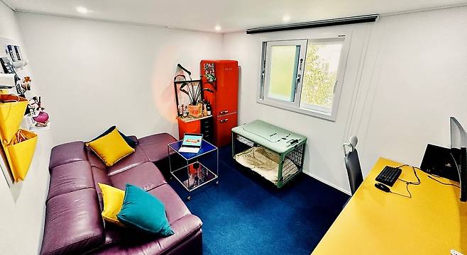 다음으로 소개할 공간은 작업방이에요. 남편이 컴퓨터 방으로 쓰던 곳인데, 지금은 컴퓨터 방이자 배꾸가 쓰는 방으로 사용하고 있습니다. 배꾸가 더욱 편하게 지낼 수 있도록 바닥에는 카펫을 깔아두었어요. 나중에 아이가 태어나면 아이방으로 사용하려고 합니다.