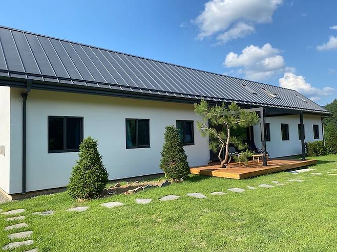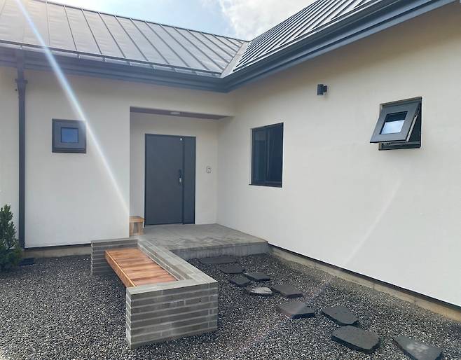 위로 올라오시면 보이는 저희 집의 전경인데요. 옆으로 길게 지어진 집이라 한 컷에 담기는 조금 어렵네요. 앞마당에는 잔디와 돌길 그리고 작은 화단들이 곳곳 있습니다.