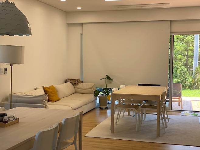 거실 창을 크게 두어 자연이 집안으로 들어오는 효과를 극대화 하였습니다. 창이 크니 채광이 굉장이 좋아요. 아침부터 저녁까지 집안으로 들어오는 각각 다른 빛을 느끼는 재미가 있답니다. 또, 앞 데크를 연결시켜 개방감이 크게 느껴지는데요. 데크에 앉아있으면 집에 있으면서도 외기를 느낄 수 있어서 거실 안과는 또 다른 기분이에요.