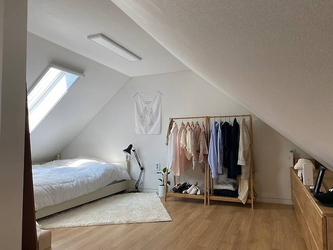 제 방은 1층 방 두 개가 트여져 있는 집에서 가장 큰 방입니다. 벽으로 살짝 나누어져 있어요. 최대한 심플하고 깨끗하게 지내고 싶어 물건들이 많이 두지 않았답니다. 내년에 결혼하면 신혼방을 만들 생각으로 제가 가장 큰 방을 사용하게 되었습니다.