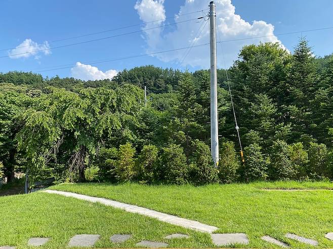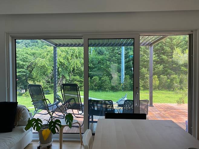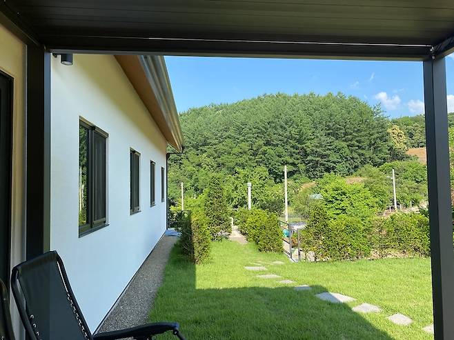 데크에 앉아서 바라보는 측면과 정면 풍경. 앞에 농원이 있는데 봄에는 벚꽃과 수국이 너무 예쁘게 핀답니다.