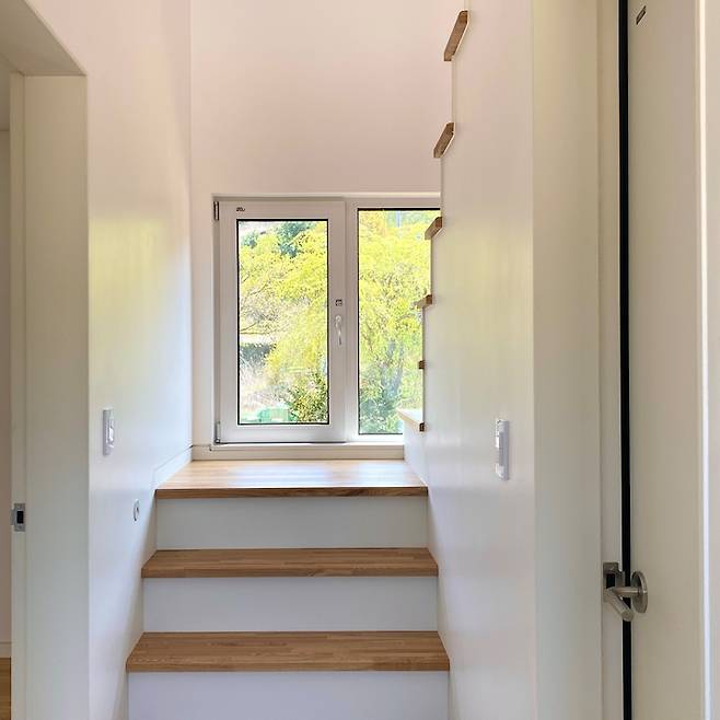 2층으로 올라가기 위한 왼쪽 복도 끝 계단입니다. 계단에 있는 창문이 포인트! 환기와 채광에 아주 큰 역할을 해주는 창입니다.