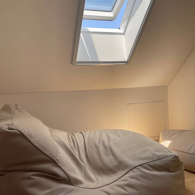 계단을 올라가면 창 아래 빈백이 놓여있구요. 양쪽으로 방이 있습니다. 이 빈백은 영화 상영시에는 1층에 내려가곤 해요.