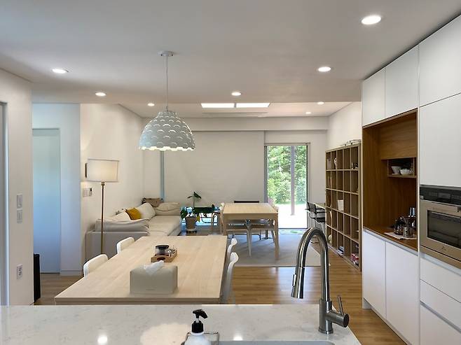 집안의 모든 등은 따뜻한 느낌의 등으로 통일했는데요. 거실과 주방은 특히 많은 사람들이 모이는 자리이며 다양한 목적으로 사용될 수 있는 공간이라 메인등 및 간접등을 다양하게 두었습니다.
