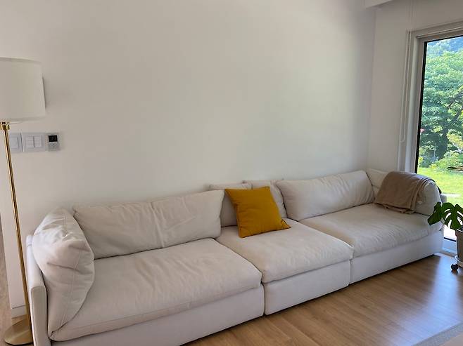 소파는 가족들이 두루두루 앉을 수 있도록 넉넉한 사이즈와 전체적인 집의 톤과 잘 어울리는 아이보리 크림색을 선택했습니다. 촉감도 부드럽고 편안해서 가족들 모두 소파 위에서 시간을 많이 보내요.