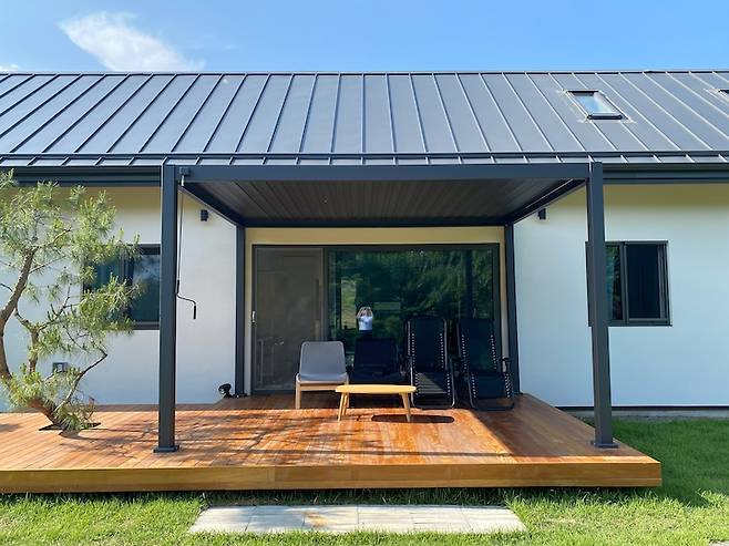 데크에는 파고라를 설치했고 한 켠에는 소나무가 심겨져 있어요. 몇 개의 의자와 상을 있어 가족들이 낮잠을 자기도 하고 다과를 먹기도 해요.
