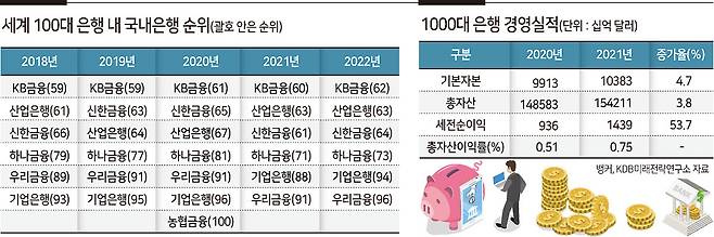 [헤럴드경제=김성훈 기자] 국내은행들이 세계 100대 은행에서 차지하는 순위가 줄줄이 하락한 것으로 나타났다. 지난해 대출 확대로 역대급 실적을 거뒀지만, 글로벌 은행업계와 비교해보면 성장성이나 수익성 모두 부진했다는 평가다. 이자 장사에서 벗어나 경쟁력을 높일 수 있는 방안을 고민해야 한다는 지적이 나온다.