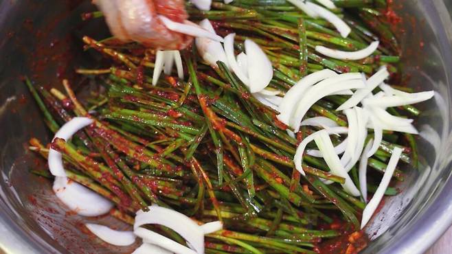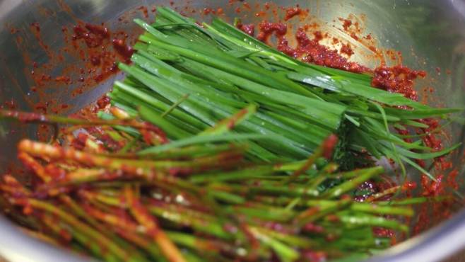 부추의 밑동부터 양념장에 넣고 먼저 버무려주세요.