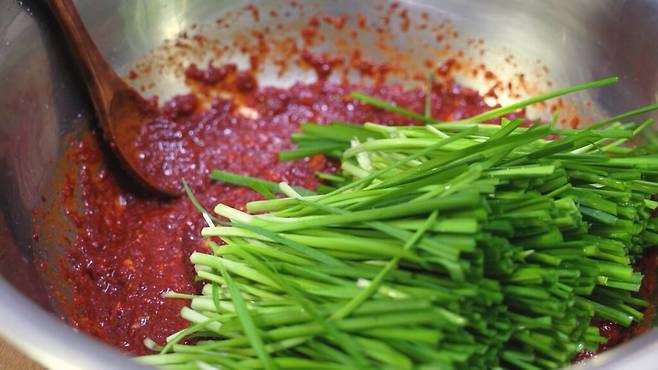 부추의 밑동부터 양념장에 넣고 먼저 버무려주세요.