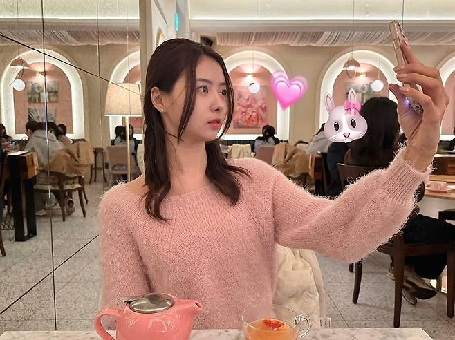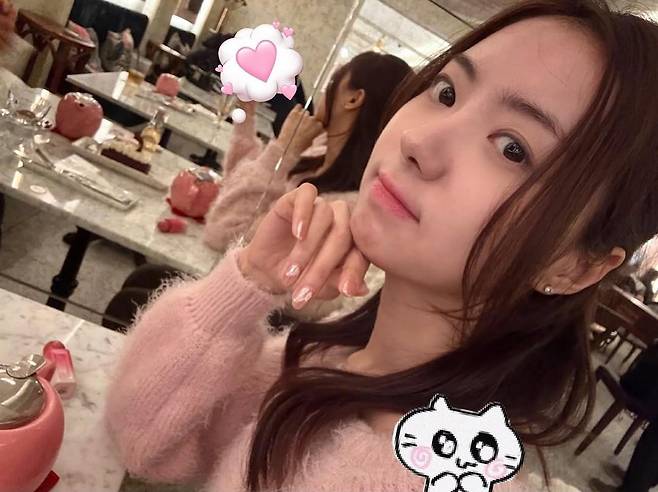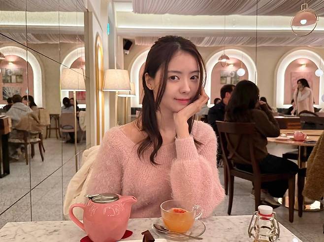 특히 눈길을 끄는 건 따뜻한 티타임을 즐기는 그녀의 여유로운 모습이다. 테이블 위에는 핑크빛 주전자가 놓여 있어 그녀의 스타일과 자연스럽게 어우러진다. 전체적인 톤이 따뜻한 파스텔 컬러로 맞춰져 있어 차분하면서도 사랑스러운 분위기가 강조된다.