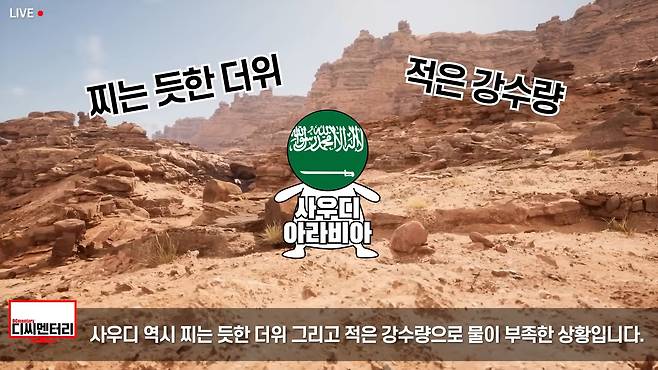 옆 나라 사우디 역시 사정은 같습니다. 사우디 역시 찌는 듯한 더위 그리고 적은 강수량으로 물이 부족한 상황입니다. 하지만 뜻밖에도 그 뜨거운 사막 아래 갇힌 지하수층을 발견했고, 그 물을 끌어와 농사도 짓고 인근 국가로 수출도 했었습니다. 그러나 과도한 지하수 사용은 지하수 고갈을 불러왔고, 이제 몇 년 후면 사우디 아래로 흐르는 지하수도 마를 예정입니다. 당연히 농업은 기대할 수 없어 심각한 위기에 직면할 텐데요.
