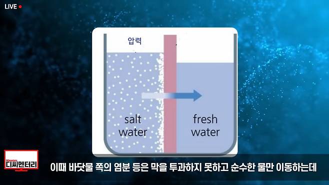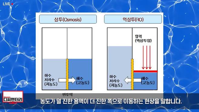 최근에는 상대적으로 에너지 소비량이 적은 역삼투법을 활용하는 게 세계적인 추세입니다. 전 세계 해수담수화 플랜트의 65% 정도가 역삼투법을 사용하죠. 역삼투법은 삼투현상을 역으로 이용하는 방법입니다. 삼투현상이란 농도가 서로 다른 용액이 '반투과성막'을 사이에 두고 있을 때 농도가 덜 진한 용액이 더 진한 쪽으로 이동하는 현상을 말합니다.
