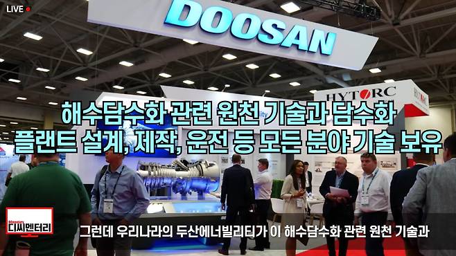 그때 한국 기업이 등장했습니다. 두산중공업(현 두산에너빌리티)인데요. 지구 전체 면적의 약 70%는 물로 이루어져 있습니다. 그 중 97.5 %는 바닷물인데, 바닷물은 염분으로 인해 직접 마실 수 없기 때문에 두산에너빌리티는 이런 생각을 했습니다. '지구에 넘쳐나는 바닷물을 담수, 즉 마실 수 있는 물로 바꿀 수 있다면 어떨까?', '만약 마시는 게 불가능하다면 농업용수나 공업용수로 사용 중인 식수를 대체할 수 있다면 얼마나 좋을까?'라고 말이죠.