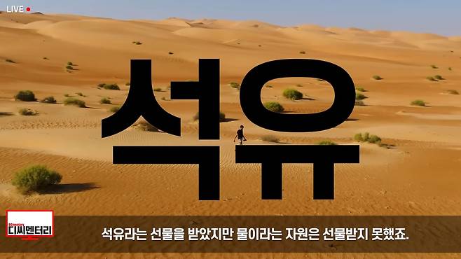 인간은 바닷물을 마시며 살 수 없습니다. 그래서 극히 적은 담수를 두고 73억 인구가 공유해야 하는데, 국가마다 수자원 분포가 다릅니다. 토양, 토질, 기후 등에 따라 지하수가 모일 수 있는 국가가 있는 반면, 모이지 못하고 사라져버리는 국가도 있죠. 그중 중동은 잘 아시다시피 하늘의 선택을 받지 못했습니다. 석유라는 선물을 받았지만, 물이라는 자원은 선물받지 못했죠.