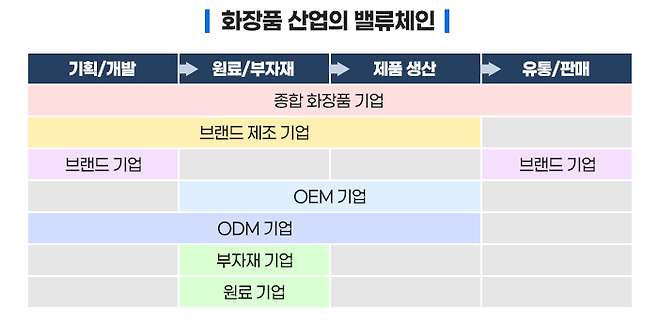 화장품 산업의 밸류체인에는 크게 브랜드 기업(브랜드 기업/브랜드 제조 기업/ 종합 화장품 기업), 제조기업(OEM/ODM), 부자재 기업, 원료 기업 등이 있습니다.