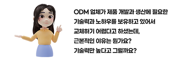 하지만, ODM(Original Design Manufacturing) 기업은 고객사로부터 제품 콘셉트 및 의도를 전달받아 기획/개발부터 제조까지 수행합니다.