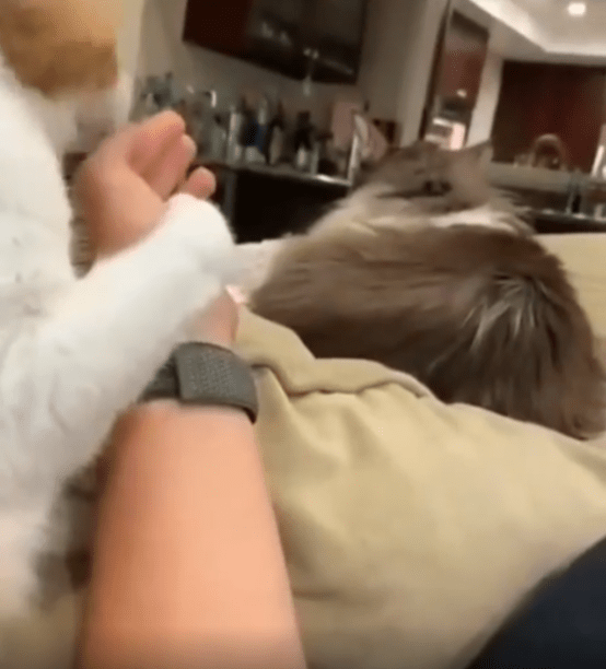 주인이 장난스레 손을 뻗어 고양이의 엉덩이 쪽을 슬쩍 쓰다듬으려 합니다. 그런데 그 순간, 예상치 못한 일이 벌어집니다. 옆에 앉아 있던 고양이 한 마리가 앞발을 번개같이 들어 주인의 손등을 살포시 막아버리죠. "그건 내가 허락하지 않았어."라는 듯한 매서운 정확함. 손끝에 닿은 그 작고 말랑한 발의 힘은 강하지 않았지만, 그 의도만큼은 또렷했습니다.