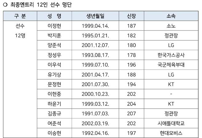 최종 명단에는 대표팀의 기둥 김종규(안양 정관장) 이승현(울산 현대모비스)을 비롯해 평가전에서 인상적인 활약을 펼친 이정현(고양 소노) 유기상·양준석(이상 창원 LG) 여준석(시애틀대) 이현중(일라와라 호크스)이 포함됐다.