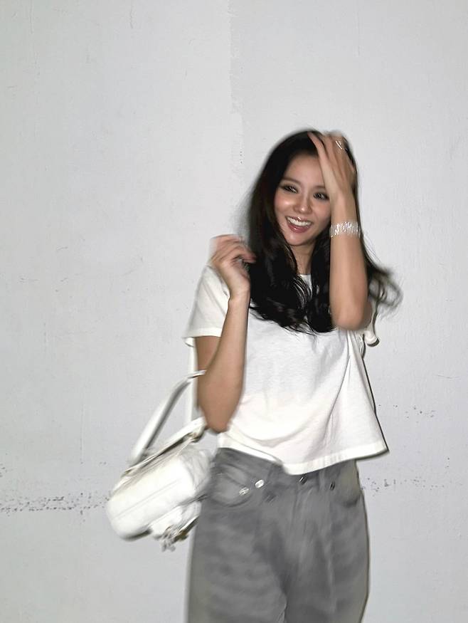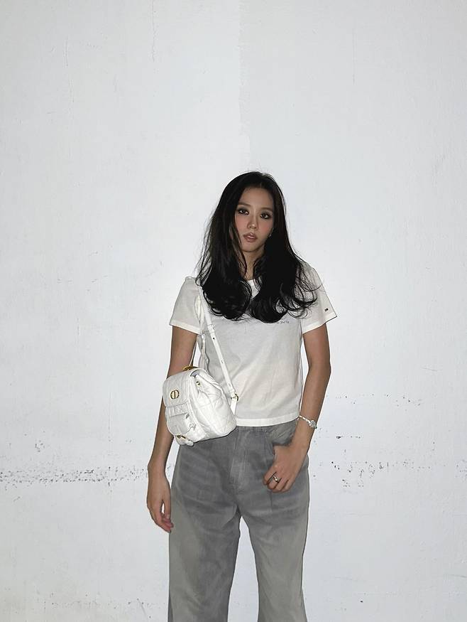 지수는 화이트 티셔츠에 그레이 톤 팬츠를 매치해 미니멀하면서도 감각적인 스타일을 완성했습니다.