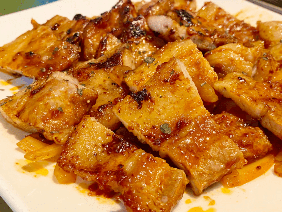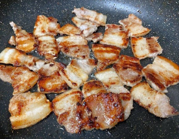 먼저 삼겹살을 먹기 좋은 크기로 자른다. 너무 두껍게 자르면 양념이 잘 배지 않고, 너무 얇으면 익히는 중에 흐물거리기 쉬우니 적당한 두께를 유지하는 게 좋다. 팬에 따로 기름을 두르지 말고 중불에서 고기를 구워준다.