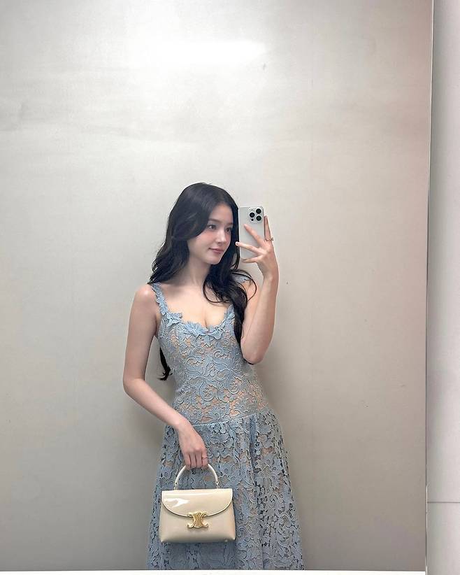 사진 속 낸시는 전체적으로 섬세한 레이스 디테일이 돋보이는 연한 블루 컬러의 롱 드레스를 착용했다. 드레스는 슬리브리스 디자인과 깊게 파인 V넥 라인이 특징으로, 상체를 가녀리게 연출하면서 동시에 우아한 실루엣을 완성했다. 화려하지만 과하지 않은 레이스 패턴이 전체 룩에 로맨틱한 무드를 더했고, 부드럽게 퍼지는 플레어 라인은 고급스러움을 극대화했다.