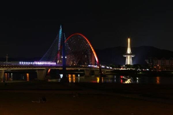 대전의 엑스포 다리는 낮보다 밤에 더욱 빛나는 명소입니다. 갑천을 가로지르는 이 다리는 독특한 디자인과 화려한 조명으로 야경 명소로 자리잡았어요.