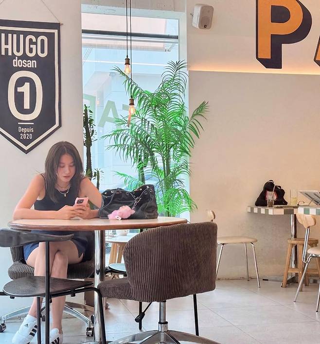 하지만 진짜 '고수'의 센스는 가방에 달린 솜뭉치 키링에서 드러났습니다. 머리부터 발끝까지 완벽하게 시크한 룩에, 의외의 '귀여움'을 한 스푼 더한 것.