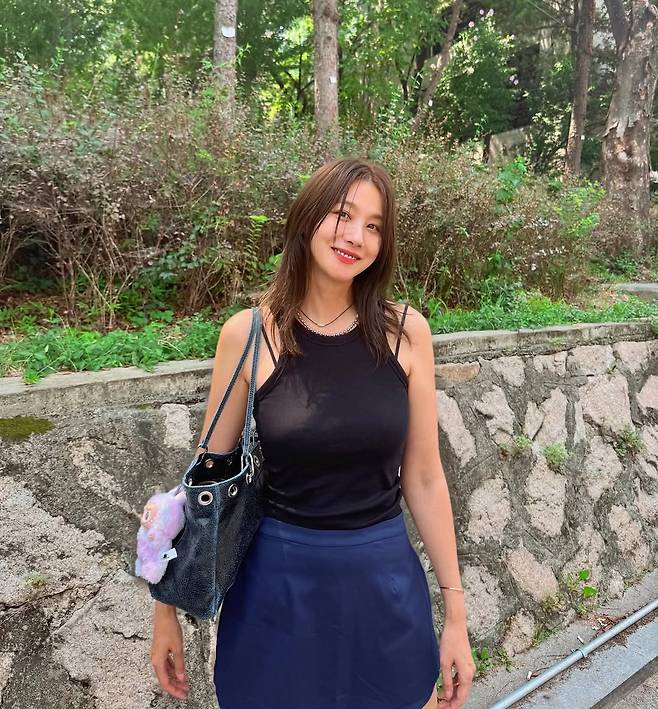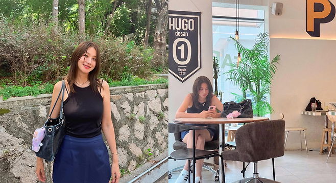 톤을 맞춘 네이비 미니스커트를 매치했습니다. 이는 군더더기 없이 자신의 장점인 '완벽한 피지컬'을 가장 잘 드러내는, 매우 영리한 스타일링입니다.