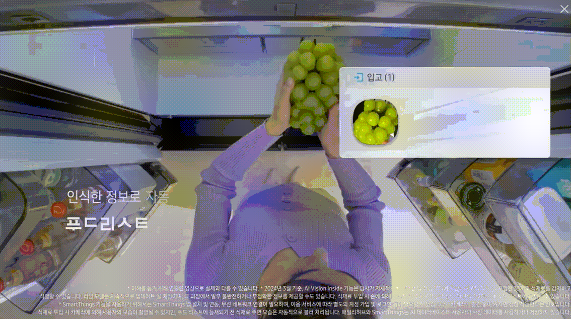AI 비전 인사이드는 냉장고 선반에 넣고 빼는 식재료, 도어 쪽에 보관하는 식재료를 내부 탑재 카메라로 촬영하고 종류를 인식해 푸드 리스트를 자동으로 만들어주는 기능이다. 비전 AI와 온디바이스 AI 기술 기반으로 신선 식품 33종을 분류하고 매칭한다.