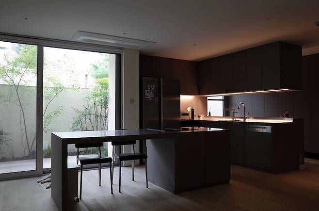 기존에 거실이였던 공간은 키친, 다이닝 공간으로 변경하였고 그 곳에 서면 정원이 한 눈에 들어옵니다.