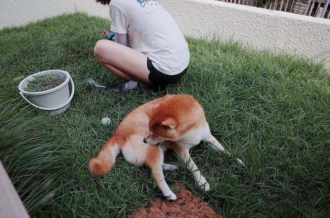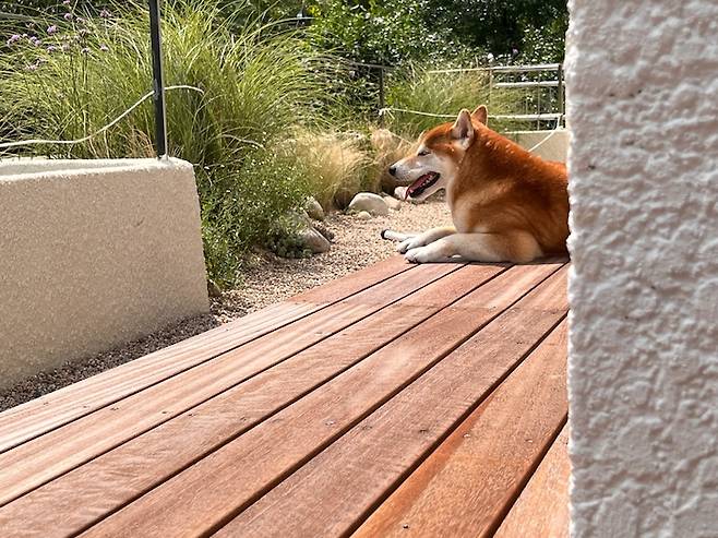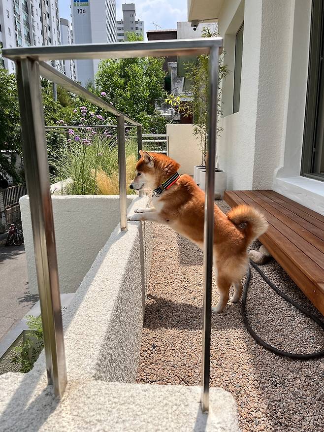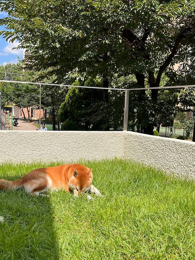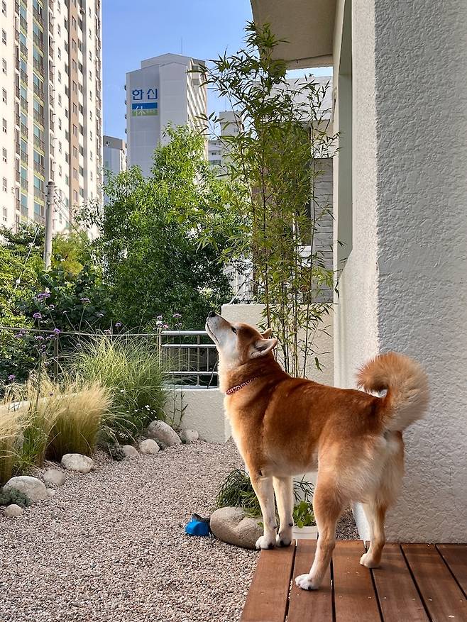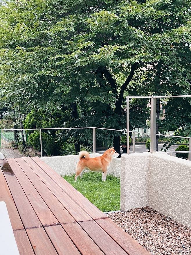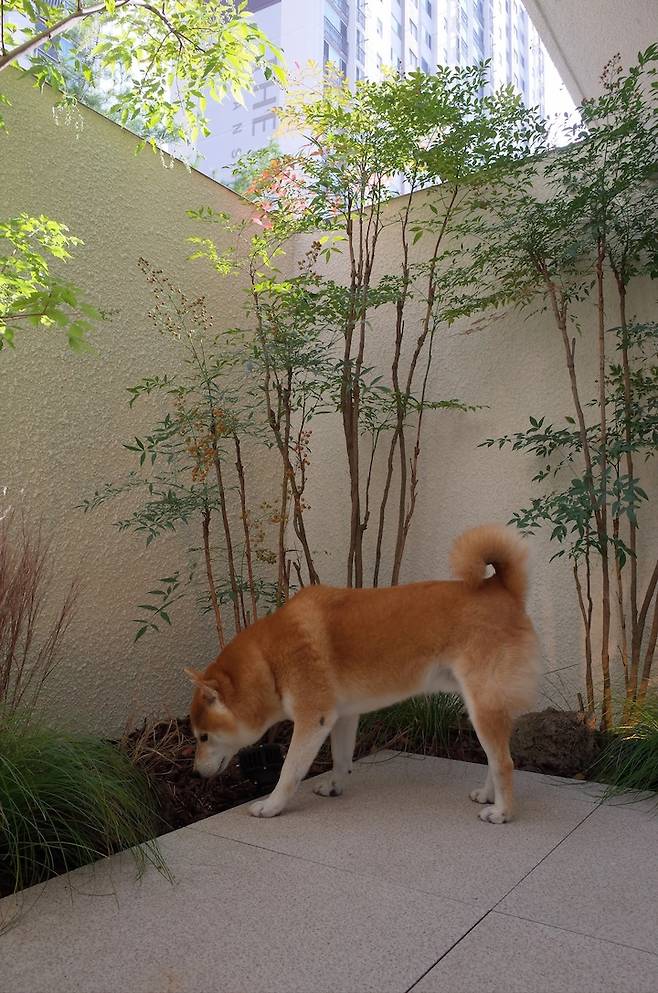실외에서만 배변을 하는 죠죠를 위해 쉬는 공간이면서도 배변에 용이하도록 넓은 코너 부분에는 특별히 잔디를 깔아주었습니다. 덕분에 특별한 정원이 만들어졌어요.