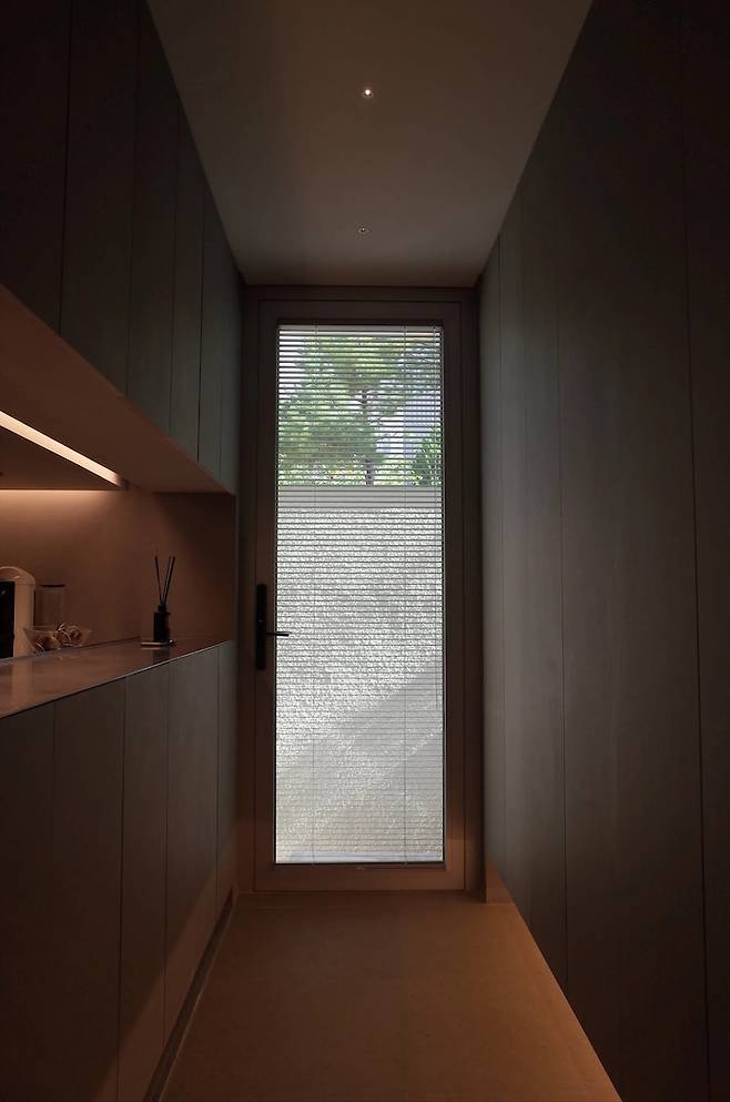 현관은 널찍하고 여유롭게 만들었어요. 유리도어로 빛이 들어와 답답하지 않고 탁 트이는 느낌을 줍니다. 현관에는 블라인드를 설치하여 사생활 보호가 필요하거나 조도 조절이 필요할 때에는 블라인드를 조절하여 생활해요.