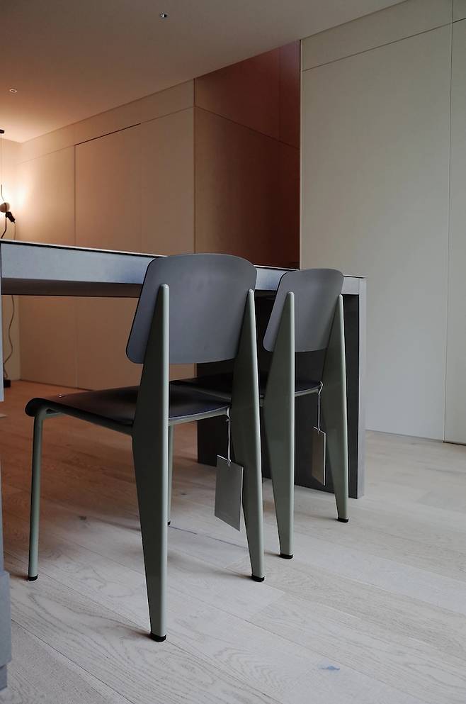 공간을 자유롭게 쓰기 위해 이동이 어려운 큰 가구는 되도록 피하고, 소파와 TV는 놓지 않았어요. 거실 공간도 마찬가지로 불필요한 복잡한 요소들은 없애버렸죠. 문과 벽을 같은 색으로 마감하고 손잡이를 숨긴 히든 도어는 공간에 자연스럽게 녹아듭니다.