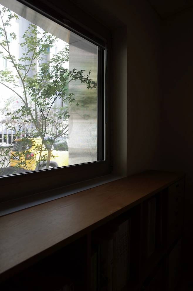 죠죠의 통로는 계단 밑에 있어 좌우로 왔다갔다 드나들 수 있어요. 계단 오른편에는 게스트룸이 있죠. 게스트룸의 창 앞에는 다간형 단풍나무을 심어 시선을 차단하였어요.