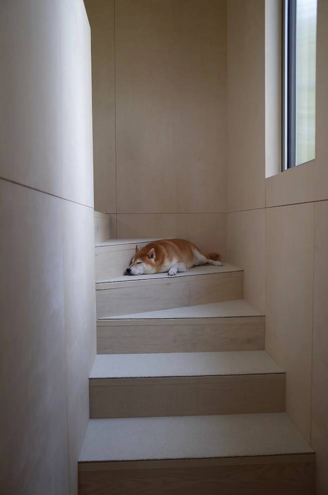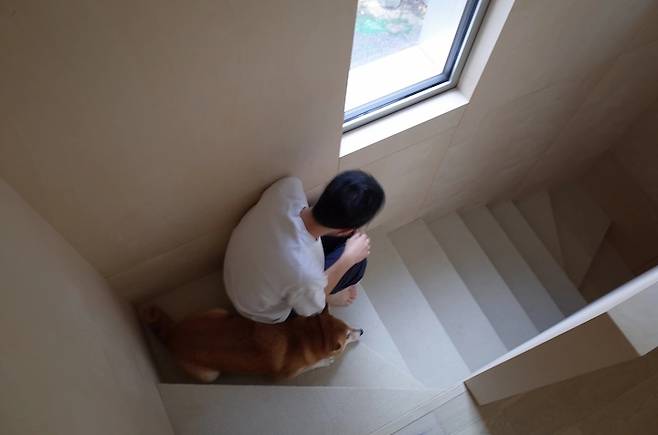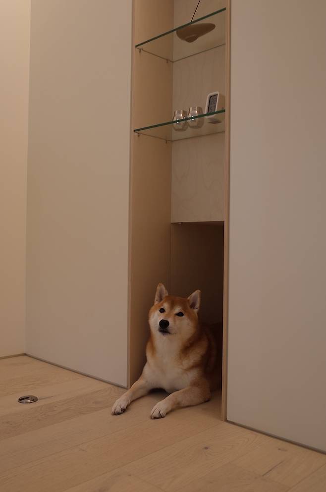 저희 집은 반려견과 함께 살아가는 집이다 보니 반려견을 위한 특별한 공간들이 있는데요. 계단 밑에는 반려견 죠죠를 위한 비밀 공간이 있어요.