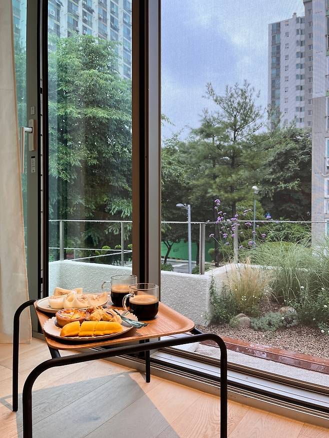 정원은 거실과 키친, 다이닝 공간에서 경치를 즐길 수 있는 동시에 외부의 시선으로부터 사생활을 보호해주기도 해요. 덕분에 블라인드는 대부분 활짝 열어놓고 지낼 수 있게 되었답니다.
