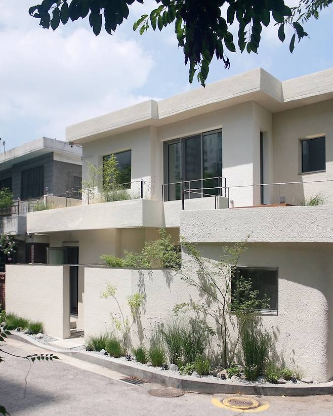 하얀 뿜칠로 거칠게 마감한 벽면은 빛의 각도에 따라 매번 다른 인상을 줍니다.