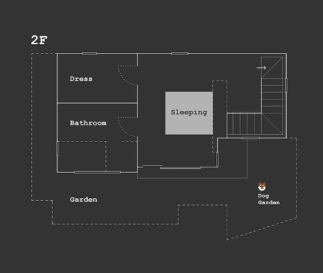 2층은 프라이빗하게 저희 부부가 사용하는 공간으로 1층보다는 훨씬 사적인 영역에 가까워요. 평일 이른 아침과 저녁 그리고 주말에는 2층에서 머무는 시간이 많아요. 침실, 욕실, 드레스룸 그리고 테라스 정원이 있습니다.