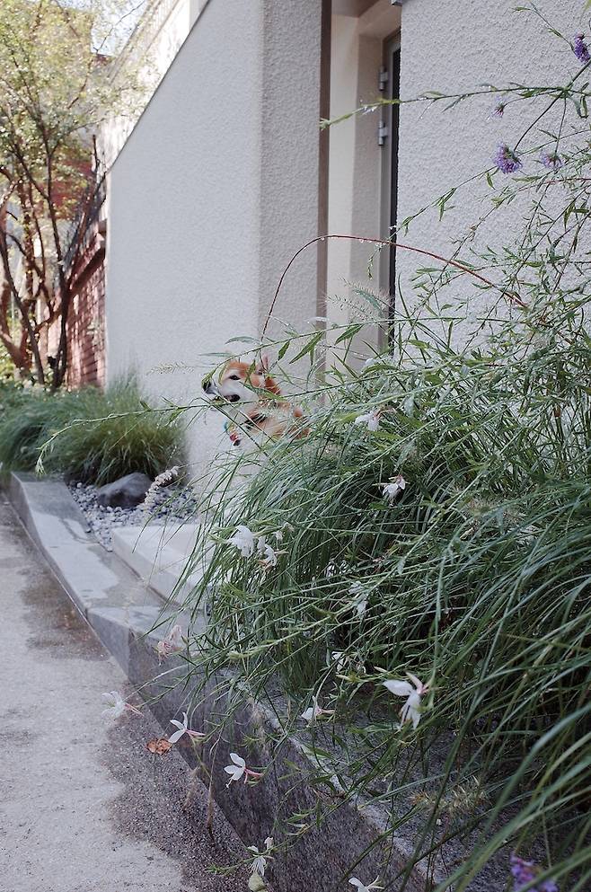 화분 대신에 곡선형으로 낮은 둔덕을 쌓아 화단 연출을 하였고, 관리하기도 쉽고 죠죠가 밟고 다니는데 편하도록 바닥에는 마사토를 깔아주었죠.