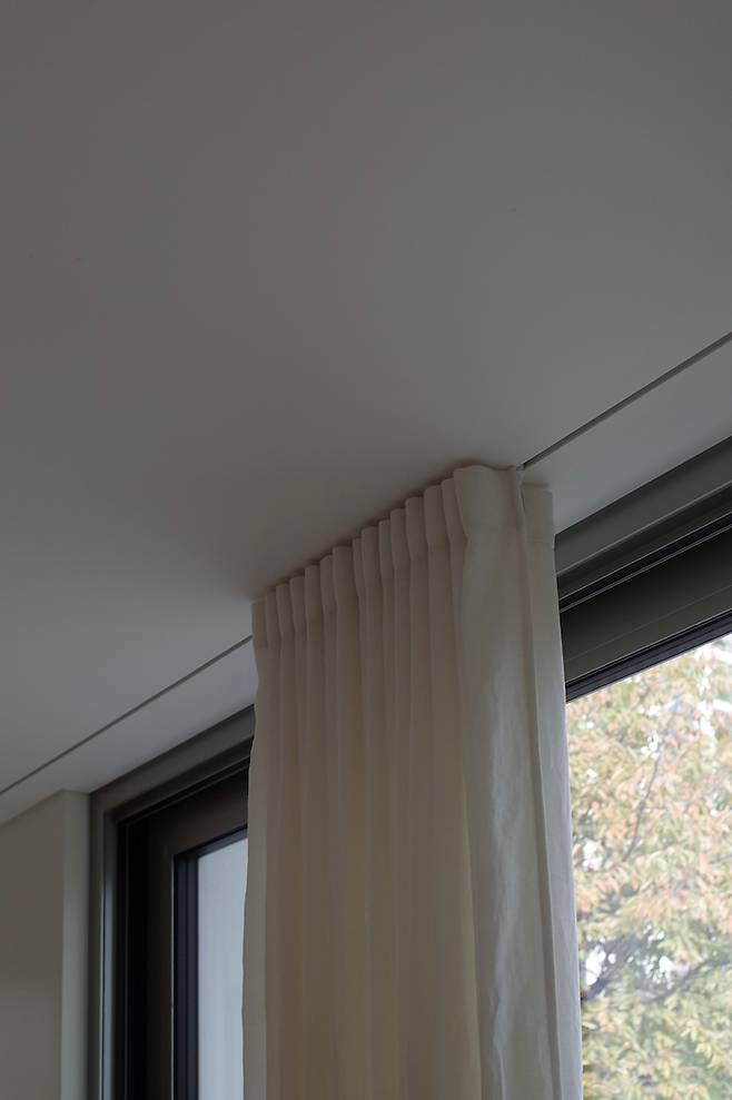 큰 창으로 보여지는 풍경에 온전히 집중될 수 있도록 커튼 레일은 천장으로 숨겨 깔끔하게 보일 수 있게 하였어요.