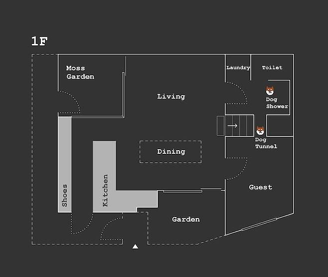 외부 손님들이 오면 보통 이 공간을 가장 많이 활용합니다. 리빙, 다이닝, 키친 공간이 함께 있는 오픈된 하나의 공간으로 이루어져 있고, 이끼 정원, 게스트룸, 게스트 화장실, 세탁실, 반려견 죠죠의 샤워실과 비밀 공간이 있어요. 외부에는 화단, 그리고 프라이빗 정원이 있습니다.