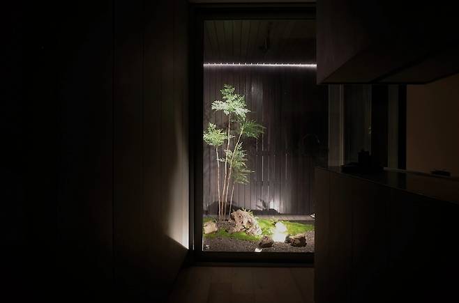 현관에서 집으로 들어왔을 때 이끼정원의 나무가 드라마틱한 효과가 연출될 수 있도록 전반적인 컨셉은 어둑어둑한 블랙으로 톤앤매너를 잡았어요.